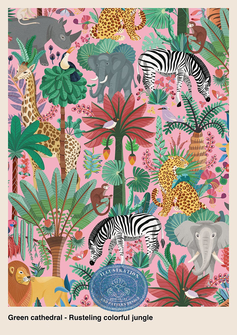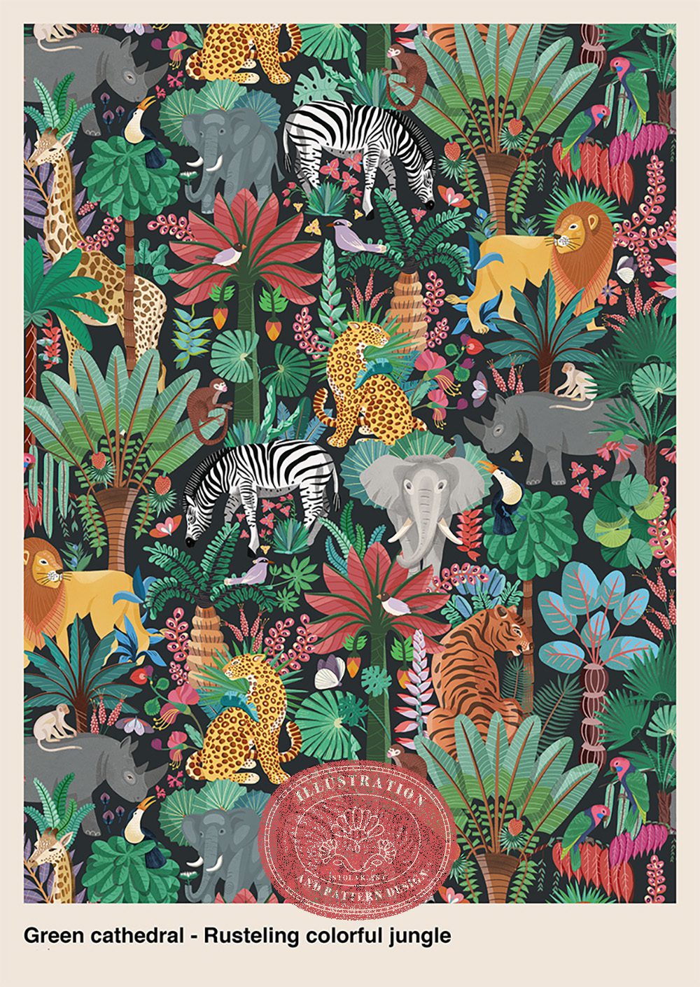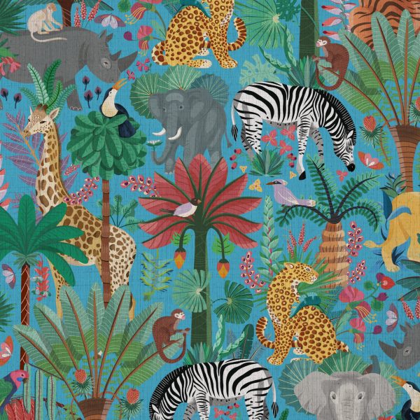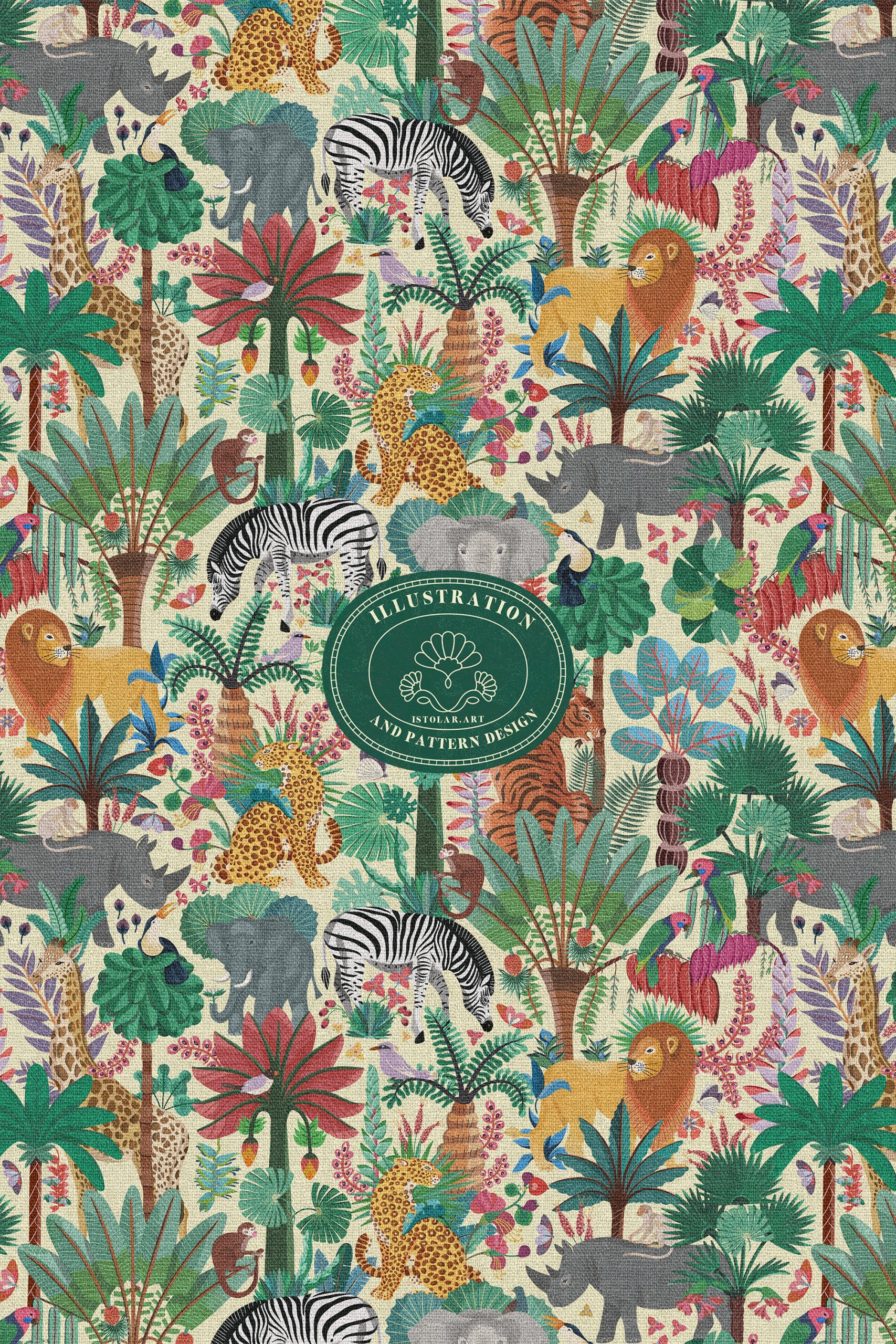 Le motif déploie une fresque déployant une jungle animée, où les animaux jouent le rôle de points focaux tandis que le feuillage assure une texture continue. Une végétation abondante s’entrelace, les animaux composent une véritable ménagerie de jungle — zèbres, éléphants, girafes, léopards, rhinocéros, singes, oiseaux et lion — disposés en strates parmi les palmiers, feuilles en éventail et fleurs tropicales. L’ensemble est volontairement dense et foisonnant.