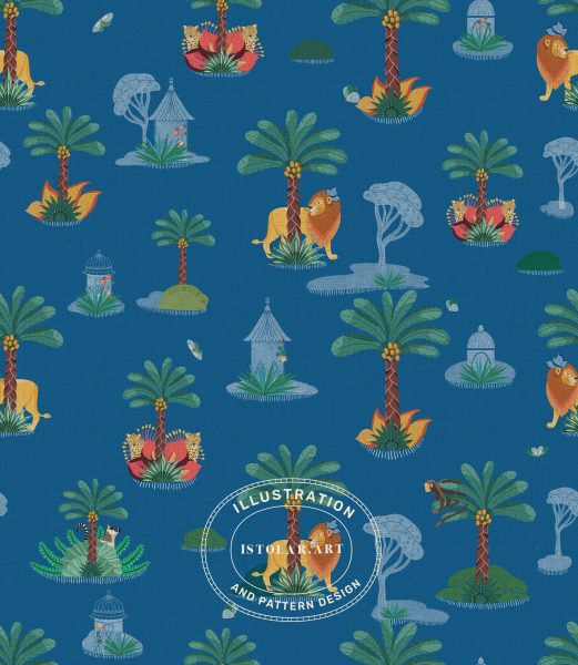 Le dessin est une répétition « conversationnelle » en demi-saut, d’échelle moyenne. II crée un flux décalé sur la surface. La composition adopte une présentation en groupements inspirée de la toile de Jouy : des palmiers s’élèvent comme des ancrages architecturaux verticaux répétés. Ils sont entourés de plantes luxuriantes et de pavillons de jardin ornés. Tout autour, des lions se reposent sous les palmiers. La surface est aussi parsemée de pavillons décoratifs et de lémuriens espiègles. Tous ces éléments, entourés d’espaces de respiration sur un fond couleur crème chaleureux.